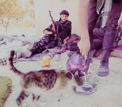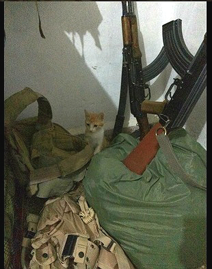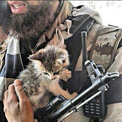 Non deve quindi meravigliare se in questo periodo in cui i militanti jihadisti riempiono i nostri schermi o le pagine del web, i gatti fanno ancora più apparizioni. Già noi “miscredenti”, come ci chiamano, siamo in adorazione dei nostri felini che postiamo su Facebook e dei quali ci raccontiamo vicendevolmente gli aneddoti. Ecco, i guerrieri jihadisti, anche armati fino ai denti, postano le proprie foto con il micino sul fucile, in pose tenere che possono lasciare perplesso chi segue l’attualità fatta di esecuzioni, bombardamenti, attentati. No, il gatto è semplicemente un simbolo e come tale stracurato.