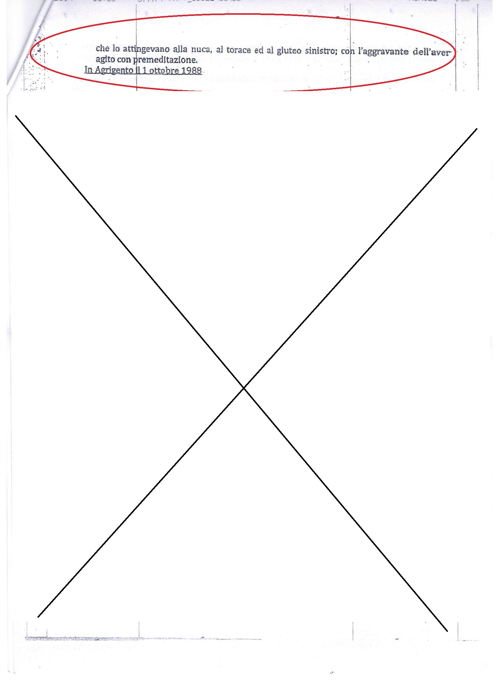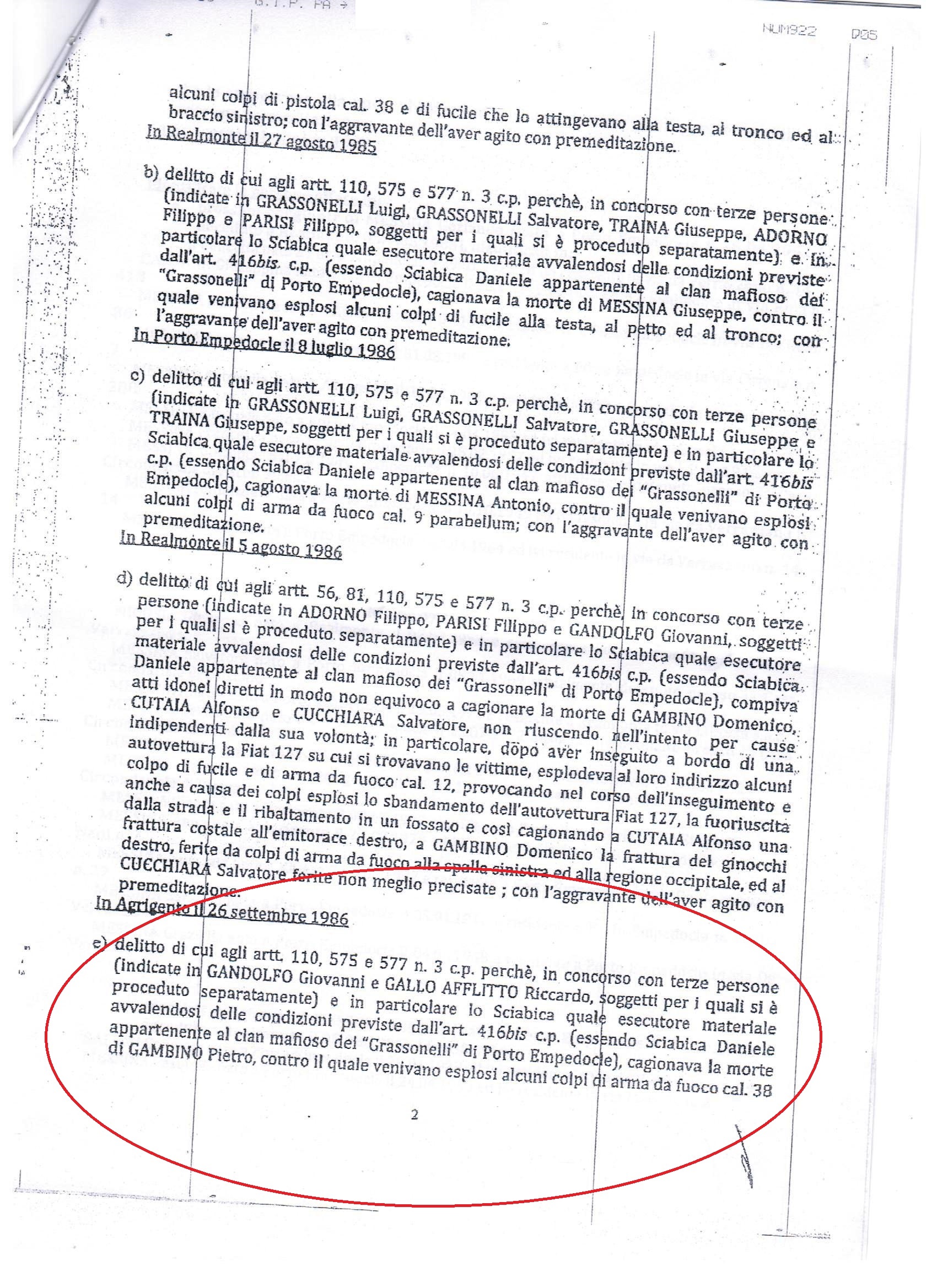 […] delitto di cui agli art. 110, 575 e 577 n.3 c.p. perché, in concorso con terze persone (indicate in GANDOLFO Giovanni e GALLO AFFLITTO Riccardo, soggetti per i quali si è proceduto separatamente) e in particolare lo Sciabica quale esecutore materiale avvalendosi delle condizioni previste dall’art. 416 bis c.p. (essendo Sciabica Daniele appartenente al clan mafioso dei”Grassonelli” di porto Empedocle), cagionava la morte di GAMBINO Pietro, contro il quale venivano esplosi alcuni colpi di arma da fuoco cal.38 che lo attingevano alla nuca, al torace ed al gluteo sinistro; con l’aggravante dell’aver agito con premeditazione.