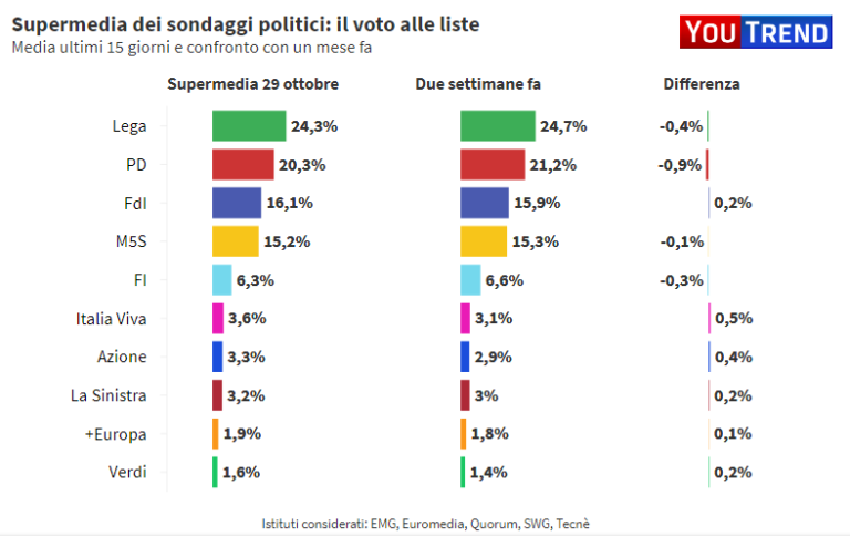 Come si può vedere dai sondaggi riportati, la Lega continua ad essere il primo partito in Italia, nonostante il lento ma continuo sgretolamento del consenso conquistato precedentemente.