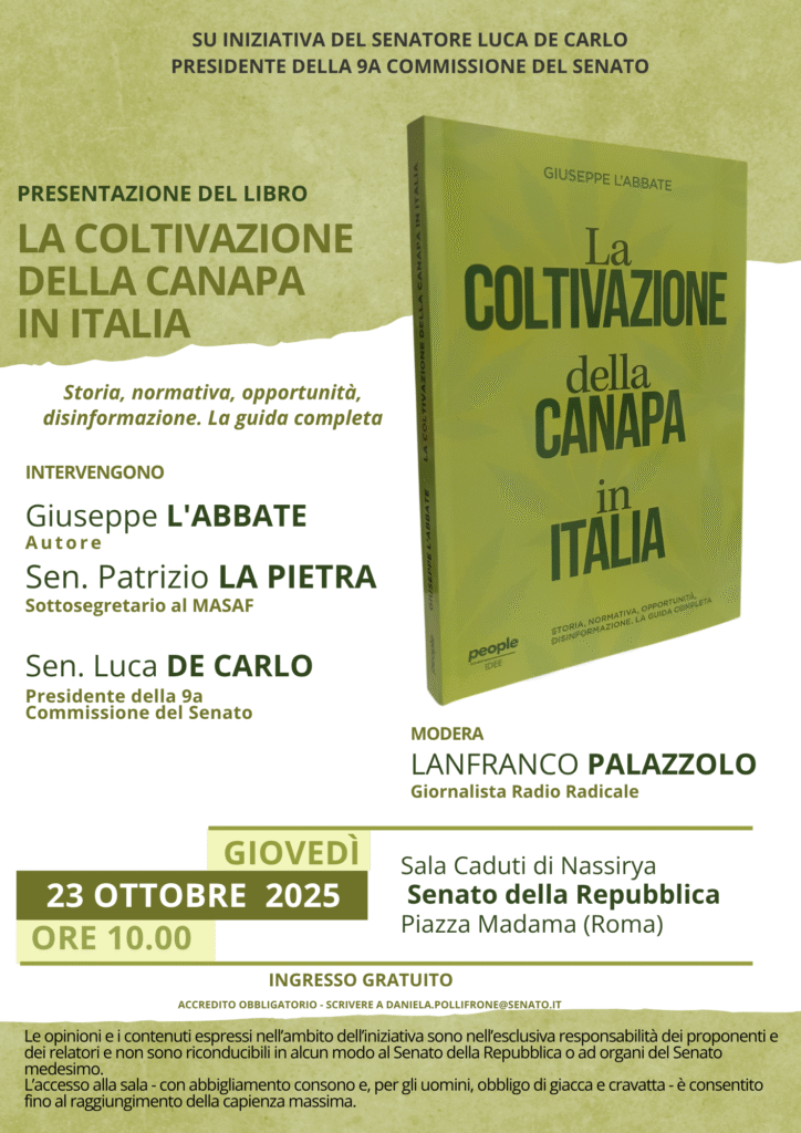 Riportare ordine e chiarezza nel dibattito sulla canapa industriale, dopo l’ondata di confusione interpretativa seguita all’approvazione dell’articolo 18 del Dl Sicurezza. È questo l’obiettivo dell’incontro che si terrà giovedì 23 ottobre alle ore 10.00, nella Sala Caduti di Nassirya del Senato della Repubblica, alla presenza del Sottosegretario Patrizio La Pietra (Ministero dell’Agricoltura, della Sovranità Alimentare e delle Foreste) e del Presidente della Commissione Agricoltura del Senato Luca De Carlo.Negli ultimi mesi, infatti, l’approvazione del decreto ha generato letture divergenti e talvolta strumentali, riaprendo il dibattito sulle infiorescenze di canapa a basso contenuto di THC. Tra interpretazioni contraddittorie di associazioni e operatori, si è creato un clima di incertezza e disorientamento che mette a rischio lo sviluppo di un comparto agricolo dalle grandi potenzialità economiche e ambientali.Ma cosa dice davvero la legge? E sarà mai possibile in Italia costruire una filiera legale e tracciata delle infiorescenze, come prodotto da fumo sotto controllo statale, fino ad arrivare a contratti di filiera strutturati come nel settore del tabacco? A queste e ad altre domande si cercherà di rispondere durante la presentazione del libro “La coltivazione della canapa in Italia” (People Edizioni), scritto dall’On. Giuseppe L’Abbate, già Sottosegretario alle Politiche Agricole, che nel volume ricostruisce l’evoluzione normativa, le opportunità economiche e la disinformazione che ancora circondano il comparto. L’incontro sarà moderato dal giornalista Lanfranco Palazzolo di Radio Radicale.“Il nodo non è la norma, ma la lettura che se ne dà – spiega l’On. Giuseppe L’Abbate –. Troppo spesso l’interpretazione giuridica viene piegata a fini di parte o usata per creare confusione, generando un dibattito distorto e polarizzato. Con questo incontro vogliamo riportare la discussione sui fatti, chiarire in modo trasparente cosa prevede la legge e offrire una base solida e condivisa da cui partire per eventuali scelte future, come quella sulla creazione di una filiera nazionale delle infiorescenze di canapa”.L’accesso è gratuito, con accredito obbligatorio. Giovedì 23 ottobre 2025 – ore 10.00 Sala Caduti di Nassirya, Senato della Repubblica – Piazza Madama, Roma |