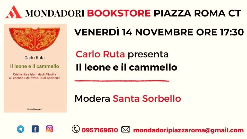 Venerdì 14 novembre 2025, ore 17.30, presso la Mondadori Bookstore di Piazza Roma lo storico Carlo Ruta presenta l’ultima sua opera, Il leone e il cammello: Cristianità e Islam dagli Altavilla a Federico II di Svevia. Il libro propone uno sguardo esplorativo del XII e del XIII secolo nel Regnum normanno e svevo e nei paesi che con il Regnum insulare e peninsulare meglio interagivano. Lo studio muove da prospettive inconsuete, che più pongono in risalto fatti notevoli sotto il profilo dell’organizzazione dei saperi, dell’elaborazione delle lingue e delle arti letterarie, dei percorsi scientifici e dei contatti interculturali. Gli scenari sono quelli di una età di mezzo poco immaginata, che incubò strutture e risorse nodali lungo gli itinerari che condussero alla modernità, lanciando esperienze e messaggi che ancora oggi fanno riflettere. L’evento si chiuderà con un dibattito aperto.
