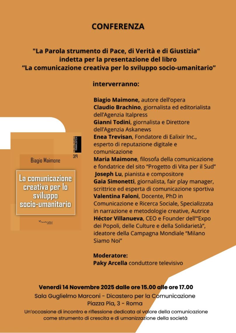 Roma, 15 novembre 2025 – Presso la prestigiosa Sala Guglielmo Marconi si è svolta la Conferenza “La Parola strumento di Pace, di Verità e di Giustizia”, organizzata in occasione della presentazione del volume di Biagio Maimone, giornalista e scrittore, “La comunicazione creativa per lo sviluppo socio-umanitario”, pubblicato da Tracceperlameta Editore.