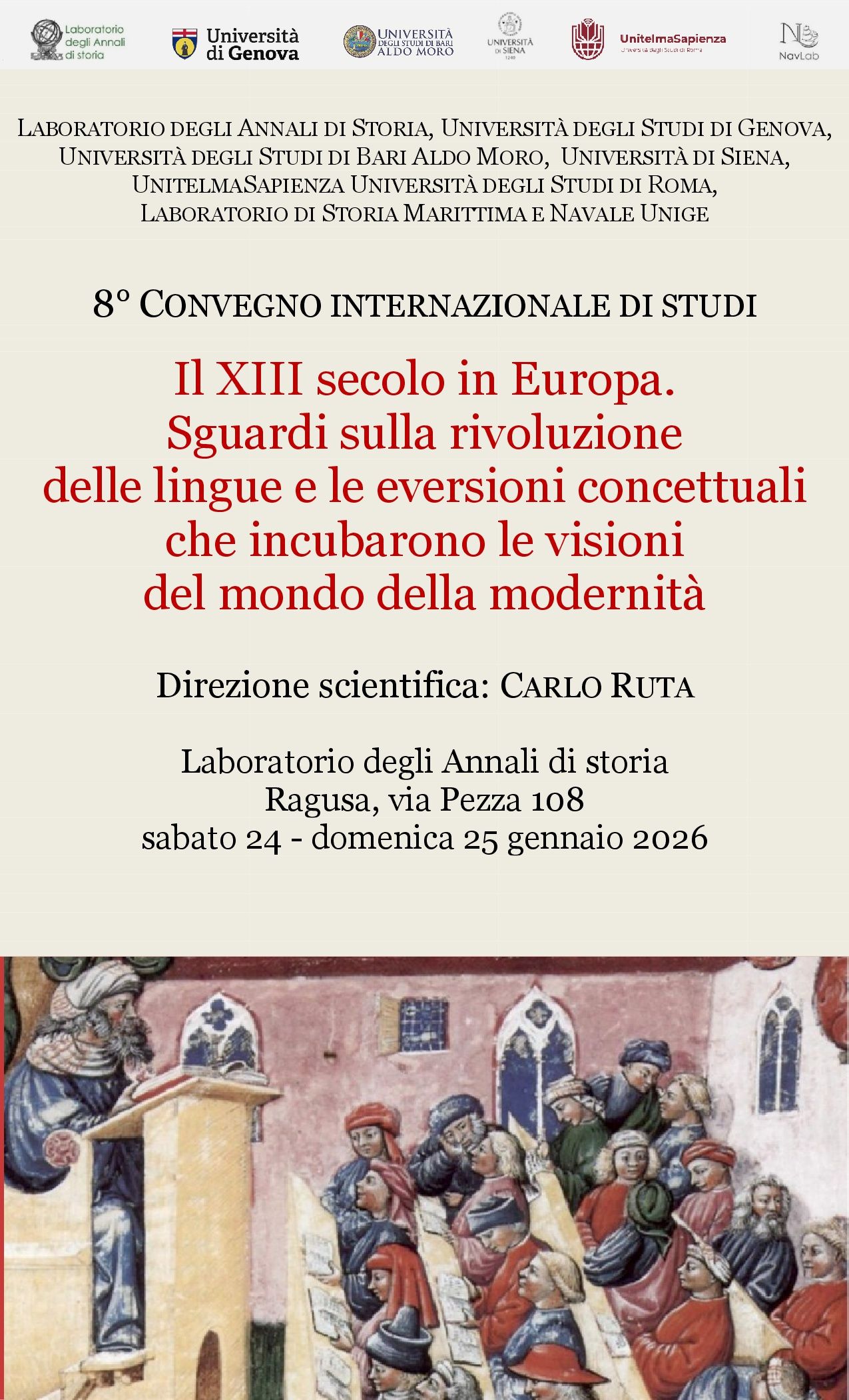 Sotto la direzione scientifica del professor Carlo Ruta, storico delle società e delle culture e fautore tra i più motivati in favore dell’interdisciplinarietà negli studi sociali e delle correlazioni tra le scienze, si aprirà a Ragusa nel pomeriggio del 24 gennaio 2026 l’ottavo Convegno internazionale promosso dal Laboratorio degli Annali di storia in collaborazione, come di consueto, con ambienti della ricerca scientifica tra i più qualificati. Parteciperanno ufficialmente l’Università degli Studi di Bari, l’Università degli Studi di Genova, l’Università di Siena e l’Unitelma Sapienza Università degli Studi di Roma, oltre che il Laboratorio di Studi Marittimi e Navali «Ferdinand Braudel», collegato istituzionalmente con l’ateneo genovese.