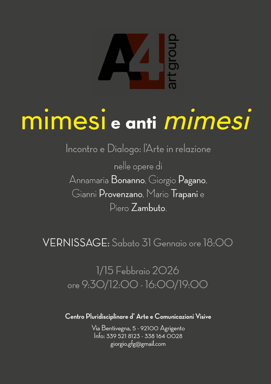 Mimesi e anti-mimesi potrebbe essere il gioco semantico che impegna gli artisti qui presenti con le loro opere: da un lato Gianni Provenzano e Giorgio Paganoe Piero Zambuto, dall’altro Anna Maria Bonanno e Mario Trapani, Una definizione che serve probabilmente all’occhio ancora vergine dell’osservatore per identificarli, a inserirli su di un piano di saperi condivisi, a meglio comprenderli nella loro attualità agrigentina più o meno consapevole. Una definizione che serve anche a organizzare i pensieri, le sensazioni, le impressioni che essi indubbiamente suscitano, lasciando un segno vivo nella memoria emozionale collettiva. Una definizione che permette cioè di inserirli in una tradizione e, contemporaneamente, di crearne di nuove. Artisti che dialogano apertamente tra di loro, confronto decisivo che valorizza più punti di vista. Una scelta che permette una relazione molto più immediata con le loro opere, in cui la fruizione dell’una influenza necessariamente la fruizione dell’altra, dentro una contaminazione tra apparenti opposti da cui inaspettatamente scaturiscono impressioni spontanee e immediate quanto il processo creativo stesso, poco legate al pensiero critico comune, di cui si supera il linguaggio mediato e con una soddisfazione interiore che raramente si prova in altri ambiti. Il riconoscimento dell’opera d’arte, in questo caso, non avviene attraverso una mediazione cognitiva in sé complessa e distaccata, studiata e analizzata, bensì attraverso un processo immediato che, come già accennato, somiglia alla stessa immediatezza creativa dell’autore. Almeno nella sua più genuina fruizione. Insomma, una collettiva inclusiva, potremmo definirla, in cui la pittura di Gianni Provenzano e di Giorgio Pagano e la scultura di Piero Zambuto somigliano – mimesi – a una realtà che viene ri–presa nella sua veridicità percettiva, potremmo dire, permettendo all’occhio una riconoscibilità più figurativa. L’opera di Mario Trapani e Anna Maria Bonanno – anti-mimesi astratto-concettuale (sarà poi così vero?) – lascia un diverso spazio all’interpretazione personale della realtà, localizzandola su più livelli. Ma tra tutti, come in un gioco di vasi comunicanti, circolano tensioni e inquietudini che li riguardano in ugual modo. Più punti di vista, dunque, e contemporanei, dentro una polifonia chesupera le mode e le dominanze culturali dei mercati,in cui prevalgono, più che la libera circolazione del sapere, il controllo e lo sfruttamento. Polifonica così come l’isola Sicilia è, ovvero, per dirla con Bufalino, plurima e molteplice. E Agrigento ne è il paradigma, isola nell’isola, che produce le sue arti, le sue musiche, le sue coinvolgenti letterature, i suoi teatri, le sue eccellenze nel mondo, superando ogni dogma critico e anzi bypassandolo con estrema naturalezza. Mimesi e anti-mimesi si incontrano superando simmetrie antitetiche: la loro pittura somiglia e nello stesso tempo si differenzia, unendosi e al contempo separandosi – per usare un’immagine molto cara a Leonardo Sciascia su L’ordine delle somiglianze – alimentando complessità e paradossi i quali, quasi per una miracolosa trasmutazione alchemica, trasformano incredibilmente il piombo delle contraddizioni, della disorganizzazione, della spiccata auto-referenzialità, del malaffare e delle malafigure, nell’oro inaspettato di un’espressione culturale, artistica e letteraria che rende Agrigento nel suo insieme un evento espressivo unico e irripetibile, in un dialettico gioco di luci e ombre magnificamente colto da Pirandello neI vecchi e i giovani: