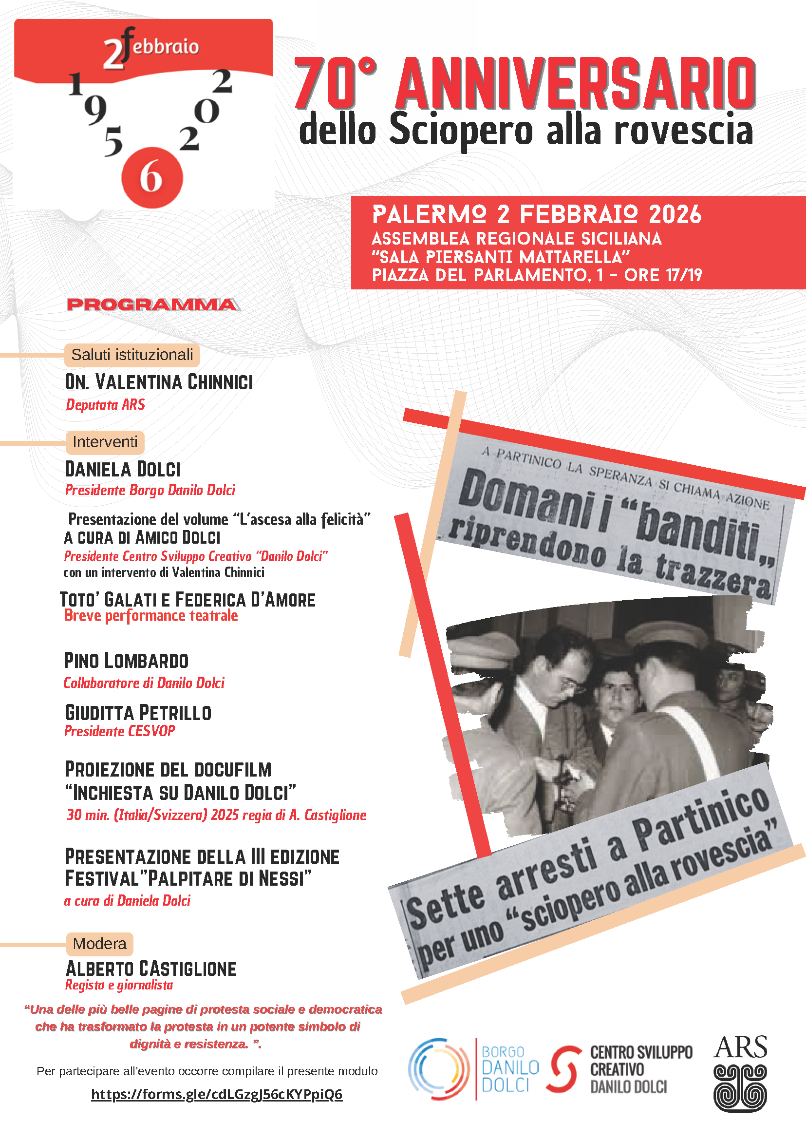 Palermo, 30 gennaio 2026 – Si terrà lunedì 2 febbraio, dalle ore 17 alle 19, presso la Sala Mattarella di Palazzo dei Normanni, sede dell’Assemblea Regionale Siciliana, l’evento per il 70° Anniversario dello “Sciopero alla rovescia”, storica forma di protesta nonviolenta ideata dal sociologo, educatore e attivista Danilo Dolci. L’iniziativa, organizzata dal Centro Sviluppo Creativo “Danilo Dolci” e dal Borgo Danilo Dolci, vuole essere un momento di riflessione e riappropriazione collettiva di un simbolo potente di dignità e resistenza civile.