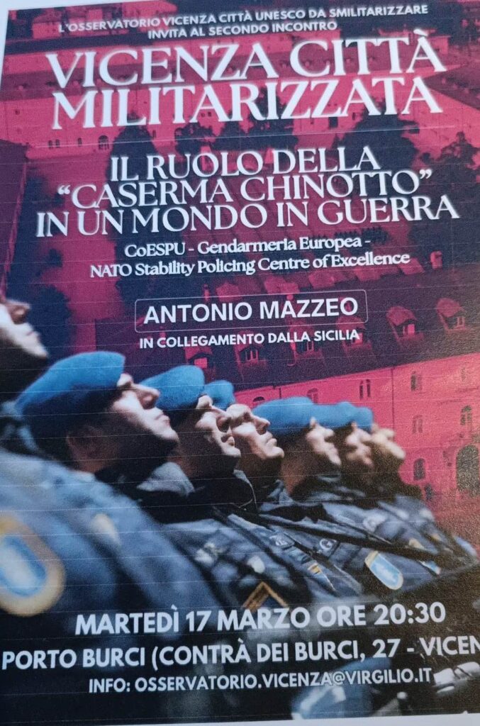 L’evento, dal titolo Vicenza Città Militarizzata: Il ruolo della Caserma Chinotto in un mondo in guerra, si terrà martedì 17 marzo alle ore 20:30 presso il centro Porto Burci, in Contrà dei Burci 27 a Vicenza.
